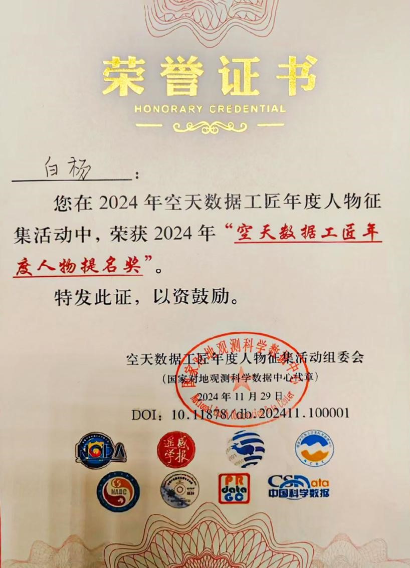 為深化我國遙感數據共享開放,推動形成國產遙感數據產品的開放共享文化,提升國產衛(wèi)星數據產品的質量和影響力,由國家對地觀測科學數據中心和《遙感學報》等機構聯(lián)合舉辦的第三屆優(yōu)秀共享開放遙感數據集征集活動于今年4月正式啟動。經作者投稿、信息審核確認、專家評審、內部公示等程序,公司申報的《國產中高分辨率寬波段多光譜衛(wèi)星數據集》榮獲“十大最具價值年度數據集”和“十大最有貢獻的數據團隊”。同期,在2024年空天數據工匠年度人物征集活動中,公司副總工程師白楊榮獲2024年“空天數據工匠年度人物提名獎”。