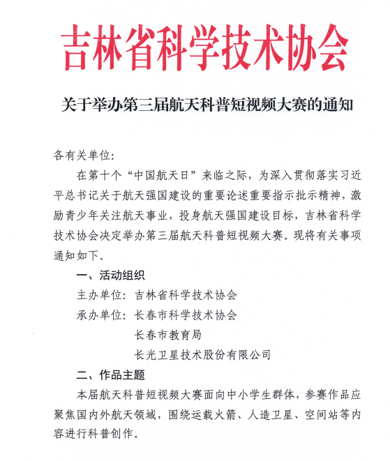 公司承辦了“第三屆航天科普短視頻大賽”。來(lái)自東北師范大學(xué)附屬小學(xué)、長(zhǎng)春高新技術(shù)產(chǎn)業(yè)開(kāi)發(fā)區(qū)慧谷學(xué)校、長(zhǎng)春經(jīng)濟(jì)技術(shù)開(kāi)發(fā)區(qū)昆山學(xué)校、遼源市實(shí)驗(yàn)中學(xué)、圖們市涼水中學(xué)、東遼縣實(shí)驗(yàn)小學(xué)等省內(nèi)20余所學(xué)校、110余名學(xué)生積極參賽,圍繞運(yùn)載火箭、人造衛(wèi)星、空間站等內(nèi)容進(jìn)行科普短視頻創(chuàng)作,形成了以賽促教、以賽促學(xué)的良好科普氛圍。