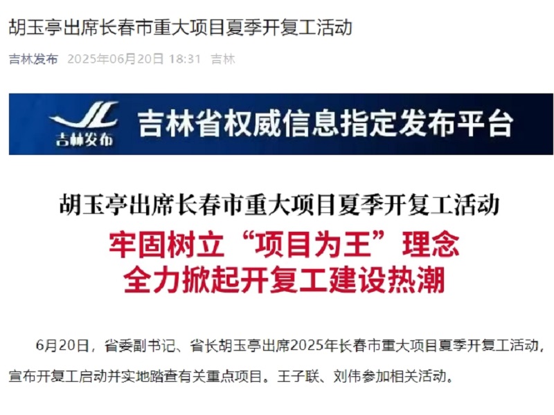 ● 吉林發(fā)布-胡玉亭出席長春市重大項目夏季開復(fù)工活動 6月20日,省委副書記、省長胡玉亭出席2025年長春市重大項目夏季開復(fù)工活動,宣布開復(fù)工啟動并實地踏查有關(guān)重點項目。王子聯(lián)、劉偉參加相關(guān)活動。 2025-06-20