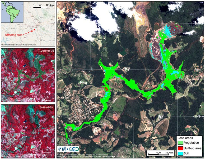 2019年1月26日,巴西發(fā)生礦壩決堤事故?!凹忠惶?hào)”衛(wèi)星第一時(shí)間響應(yīng)中國(guó)GEO的拍攝需求,通過(guò)拍攝分析發(fā)現(xiàn),礦渣造成了河道污染,威脅下游居民的生活用水。